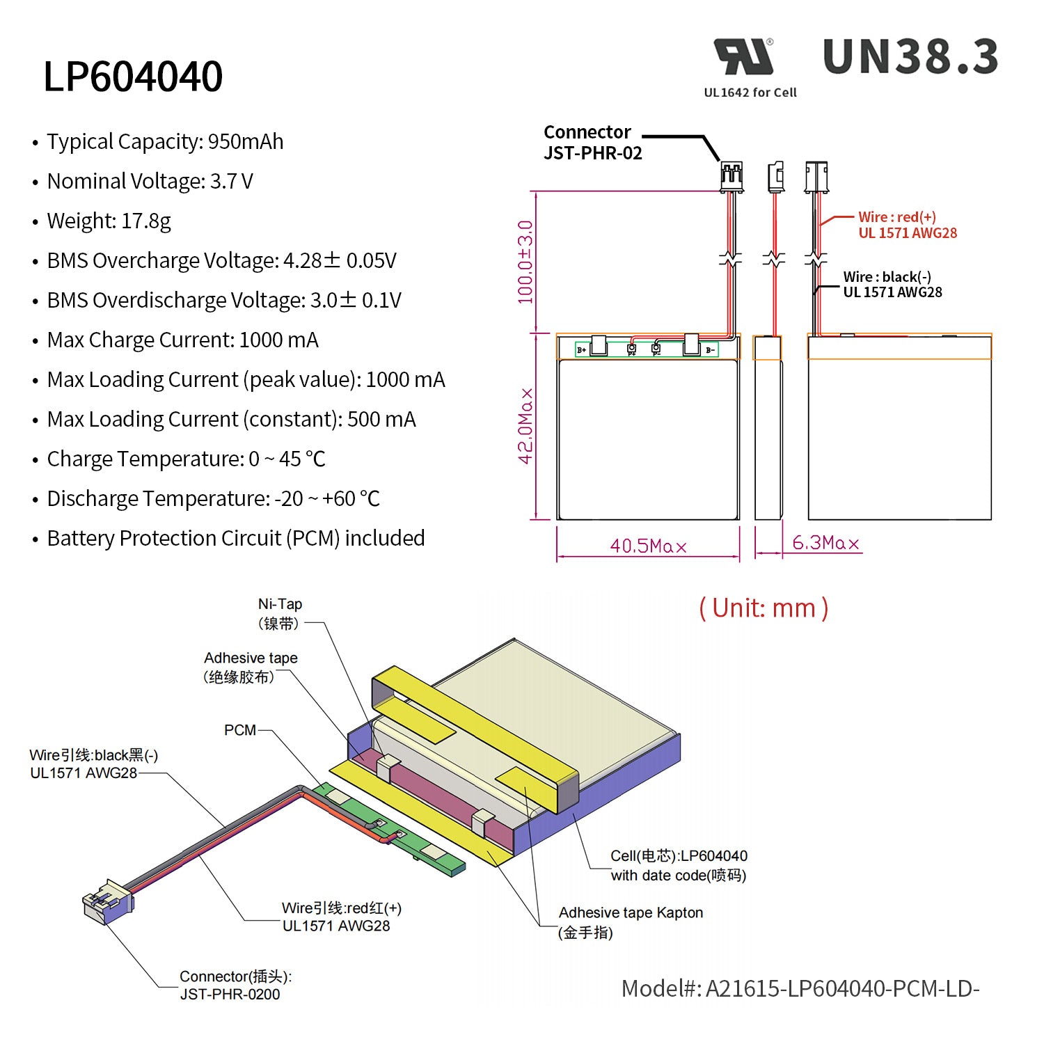 Rechargeable Li-ion Polymer battery. Nominal voltage of 3.7V