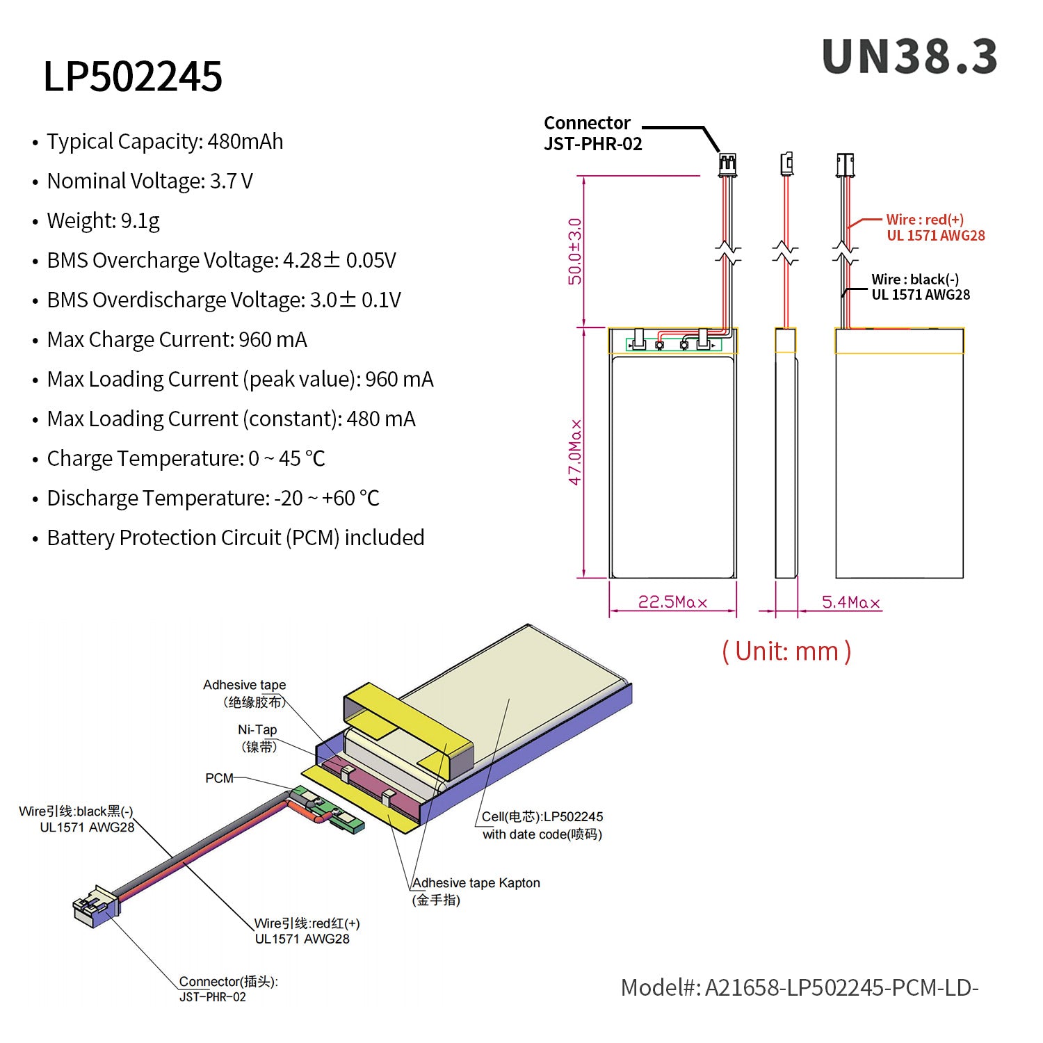 • VOLTAGE— 3.7V; Typical capacity: 480mAh, Min capacity: 420mAh; Weight: approximate 9.6g; Size: 5.4 x 22.5 x 47mm(WxLxH)