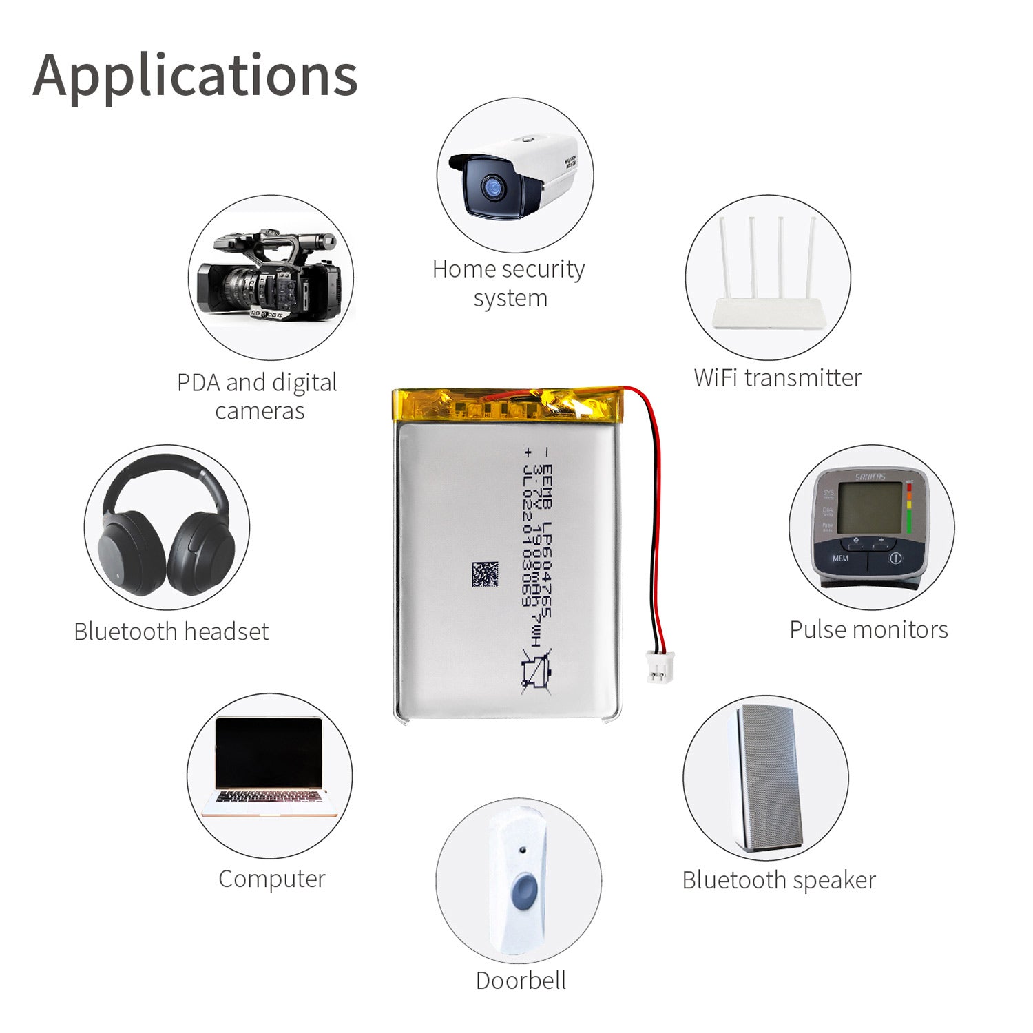 • APPLICATION—Suitable for bluetooth speaker, dash cam, keyboard and mouse, Wi-Fi enabled smart home systems, PDA and digital cameras, GPS, monitoring units, notebook computers, e-books, telematics, tracking devices, sleep management equipment, blood oxygen tracking equipment, pulse monitors.