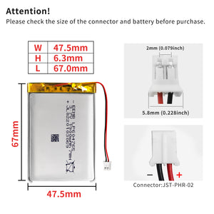 • VOLTAGE— 3.7V; Typical capacity: 1900mAh, Min capacity: 1620mAh; Weight: approximate 38g; Size: 6.3 x 47.5 x 67mm(WxLxH)