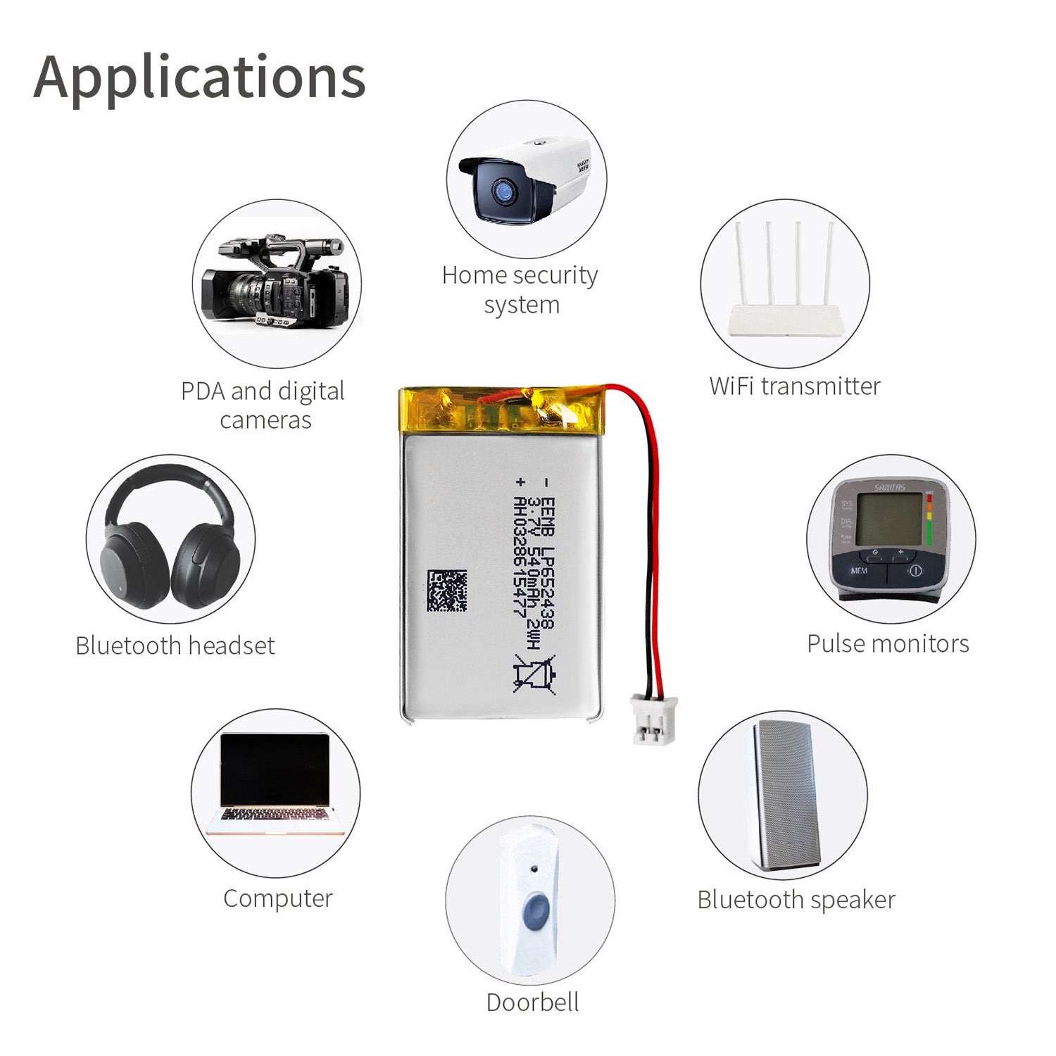• STORAGE & APPLICATION—Keep the cells in 40%-60% charged state during long period storage. We recommend to charge the battery every 3 months after receipt of the battery and maintain the voltage 3.7-4.0V. Store battery in cool and dry place.//SUITABLE for Bluetooth speaker, dash cam, keyboard and mouse, Wi-Fi smart home systems, PDA and digital cameras, GPS, monitoring units, e-books, tracking devices, sleep management equipment, blood oxygen tracking equipment, pulse monitors, wireless, IoT.