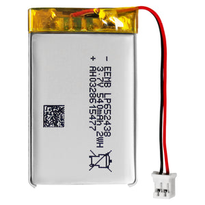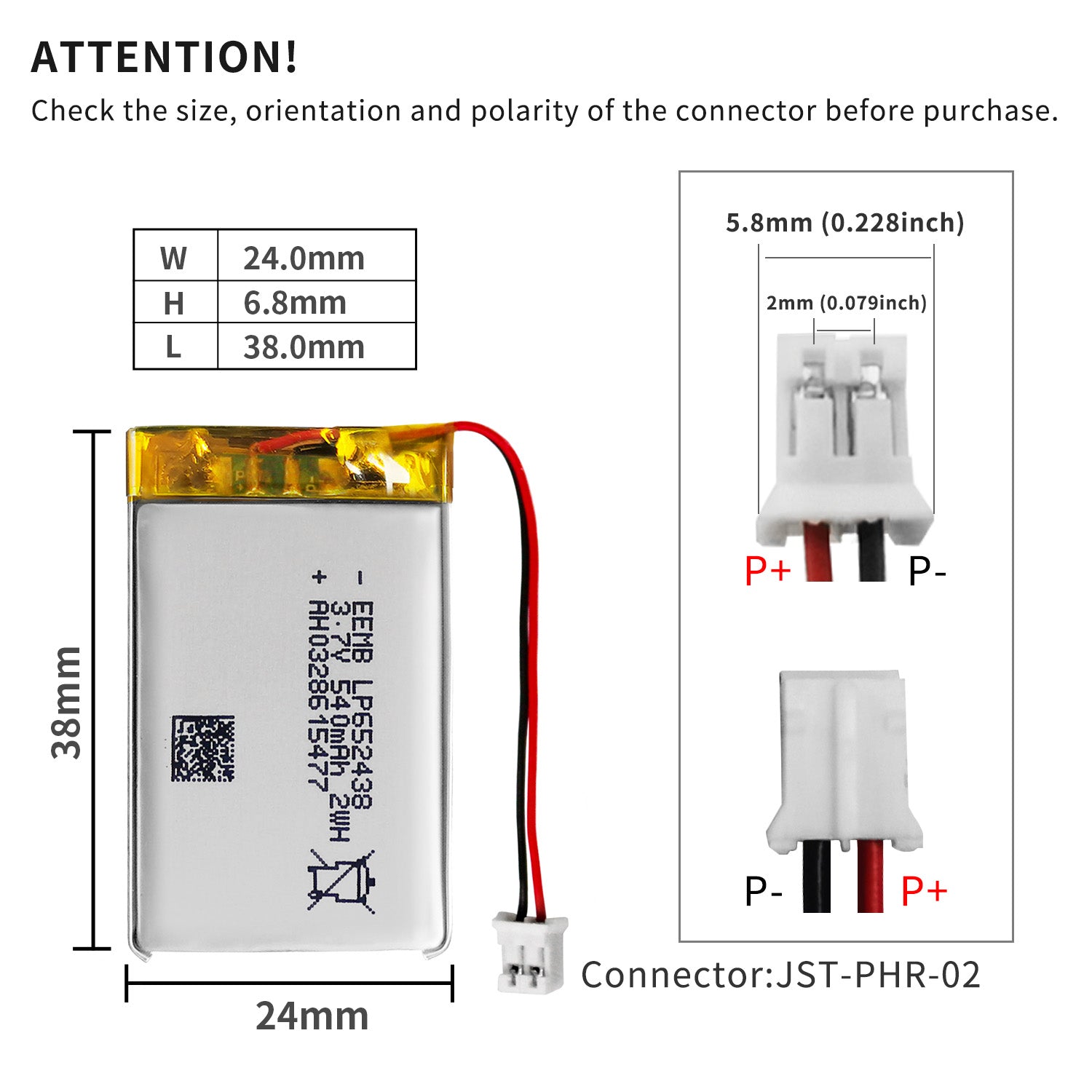 • BASIC INFO—Voltage: 3.7V; Typical capacity: 540mAh, Min capacity: 480mAh; Weight: approximate 10.4g; Size: 24 x 38 x 6.5mm (WxLxH)