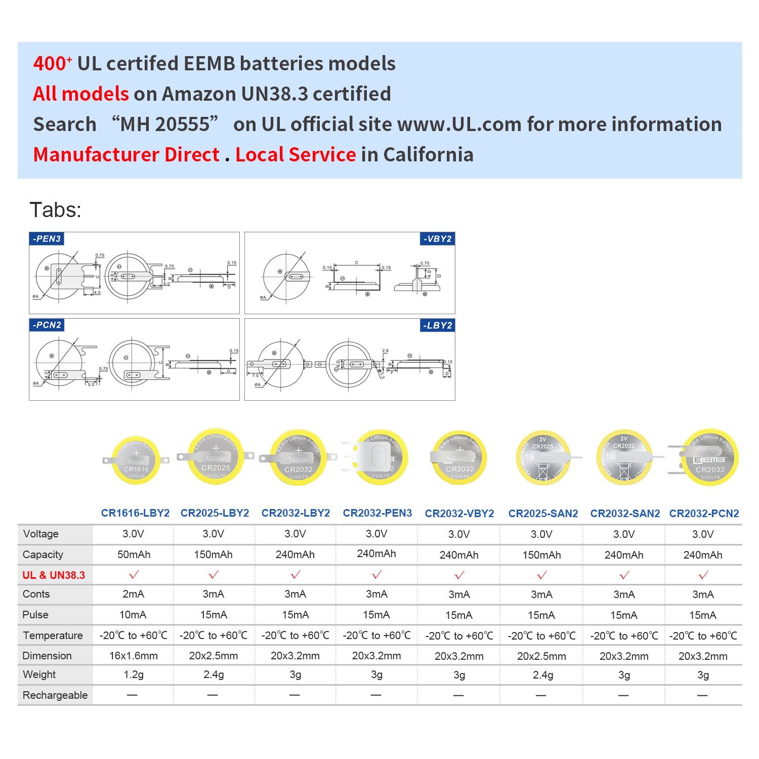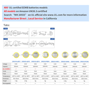 • CERTIFICATIONS—This is not a rechargeable battery. DO NOT Charge battery. UN 38.3 compliant. More than 400 EEMB battery models are UL certified. Search "MH20555" on UL for all EEMB UL certification information.