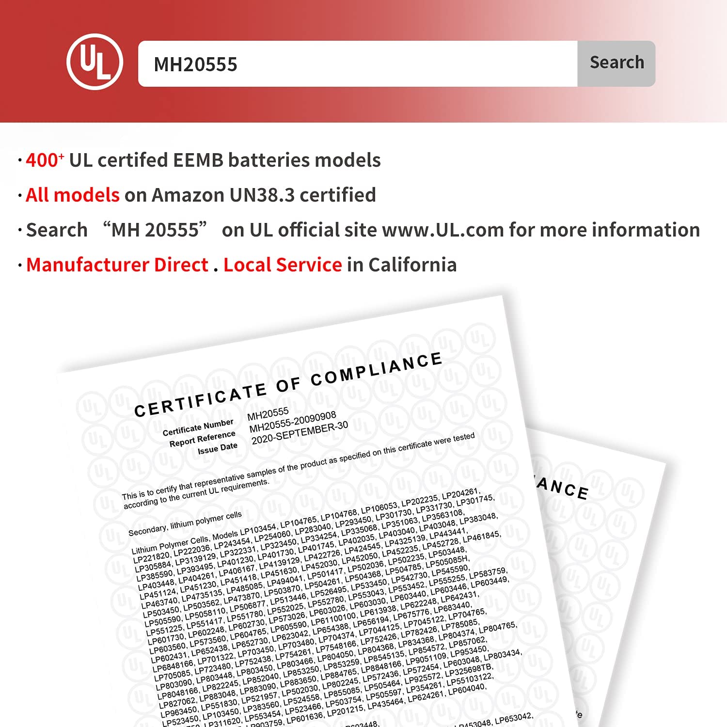 We are ISO 9001 Qualified. Most of our batteries are in compliance with UL and UN 38.3. We thrive to provide our customers with premium quality products with bulk savings. We also take pride in providing the highest level of customer satisfaction. Please feel free to contact us for large quantity quotes and dedicated engineering solutions of custom battery cell, battery terminations, and custom battery packs to meet your specifications.